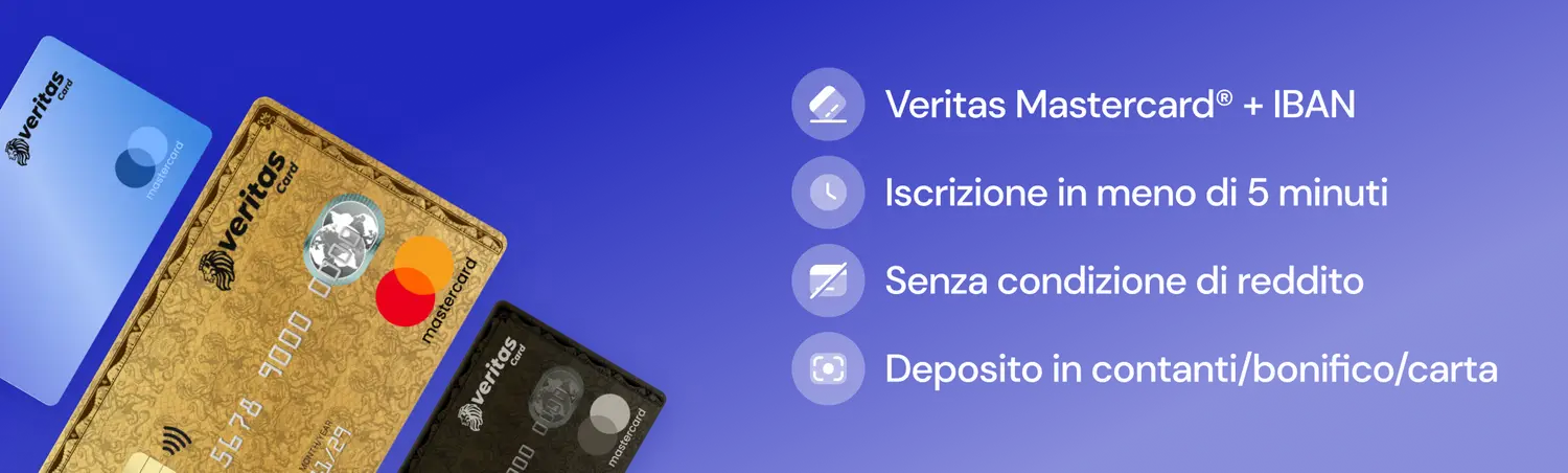 Per 29.90€/anno (attualmente in promozione invece di 128.90€/anno) benefici di un conto + RIB italiano dedicato, 2 carte: 1 fisica (Mastercard® Gold) + 1 virtuale per i tuoi acquisti online, possibilità di deposito tramite bonifico, CB, o in contanti, trasferimenti istantanei e gratuiti (tra conti Veritas), consegna gratuita della carta, fino a 67.000€ di ricarica e offerte & promozioni speciali.